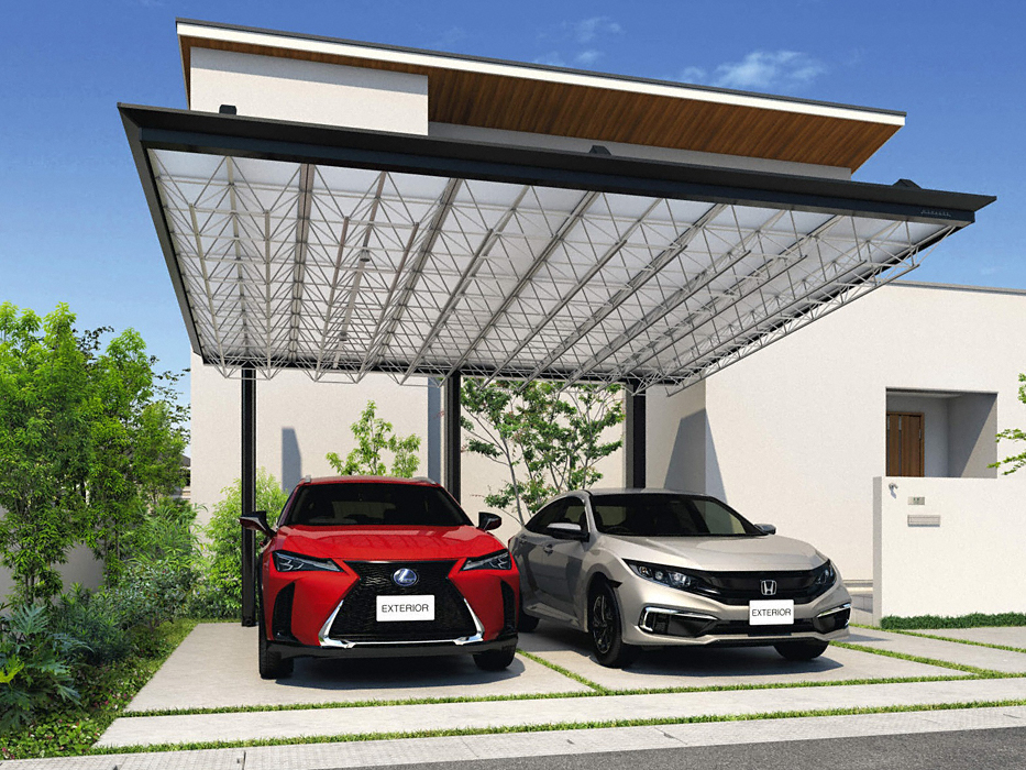 太陽光発電搭載モデルは電気代削減に貢献し、環境にも配慮できます。デザイン住宅や高級住宅街では、建物と調和する美しいカーポートが資産価値を高めます。