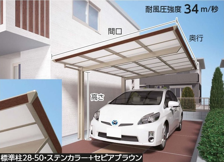 ナフコのカーポートはさらに耐風強度性能をアップさせる「アップグレードW」で38m/sから42m/sにすることも可能。